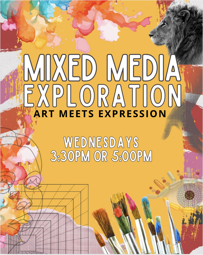 Mixed Media Exploration: Art Meets Expression invites students on a creative journey through painting, sculpture, and collage using materials like clay, watercolor, and printmaking.