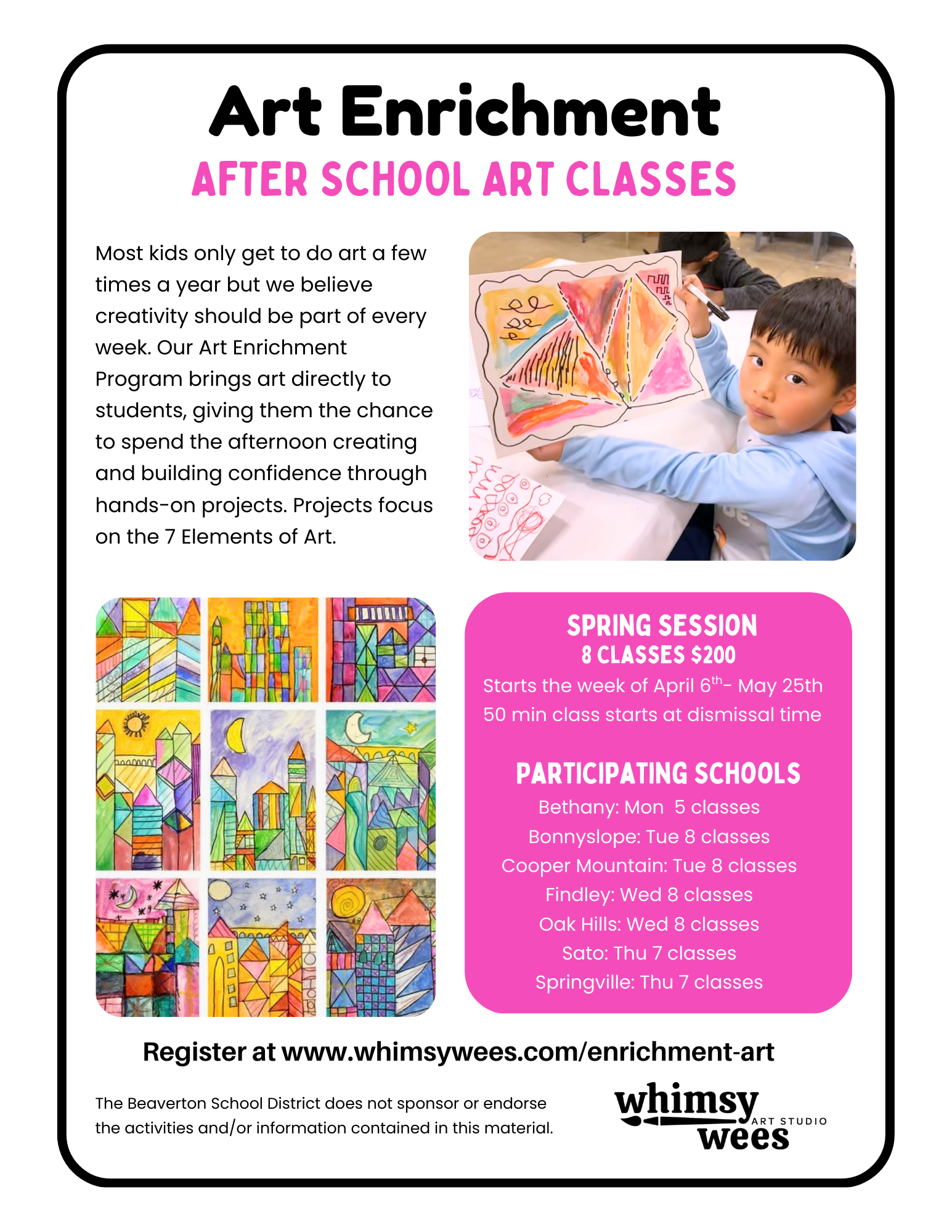 Most children only get small glimpses of art during the school year, but we’re working to change that. Our After School Art Enrichment Program brings high-quality art classes directly to your child’s school, turning one afternoon each week into dedicated creative time. After dismissal, students will be walked to the art class where they experiment with materials, develop real art skills, and explore the work of influential artists. K–5th grade students build imagination, confidence, and an appreciation for art that becomes a meaningful and consistent part of their week.